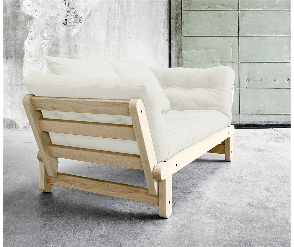 Il divano letto Beat in massello di pino scandinavo può trasformarsi, grazie ai braccioli laterali obliqui, in chaise longue o in letto a posto singolo.