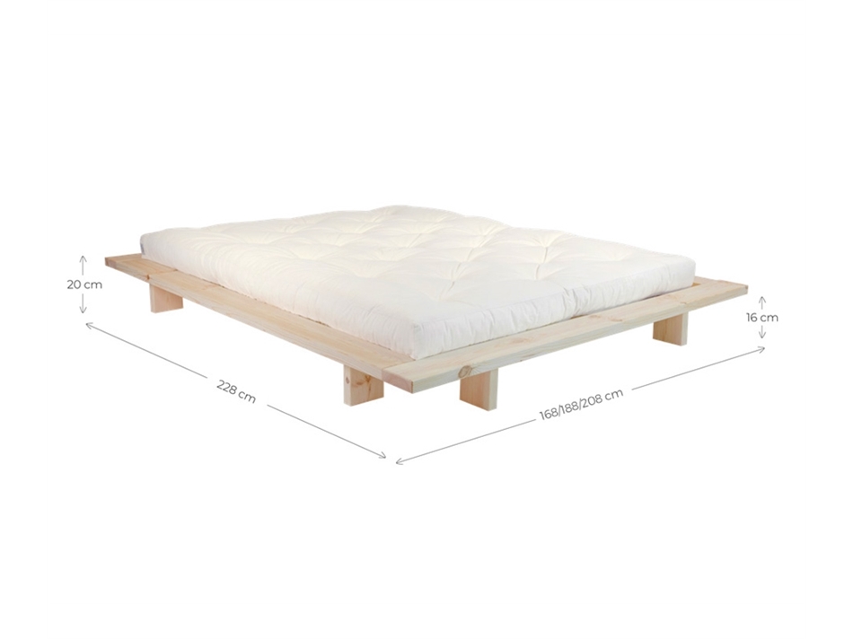 Letto a doghe disponibile in versione matrimoniale (160x200cm), king size (180x200cm) e alla francese (140x200cm), realizzato in pino scandinavo massiccio . Con un design estremamente lineare, si caratterizza principalmente per il particolare intreccio dei piedi, formati da due rettangoli in legno posti perpendicolarmente tra loro. Le doghe sono incluse. Il futon e i cuscini non sono inclusi. Misure: Interne: cm 140/160/180x200 Esterne: cm 168/188/208x228 Altezza: cm 20 Spessore gi...
